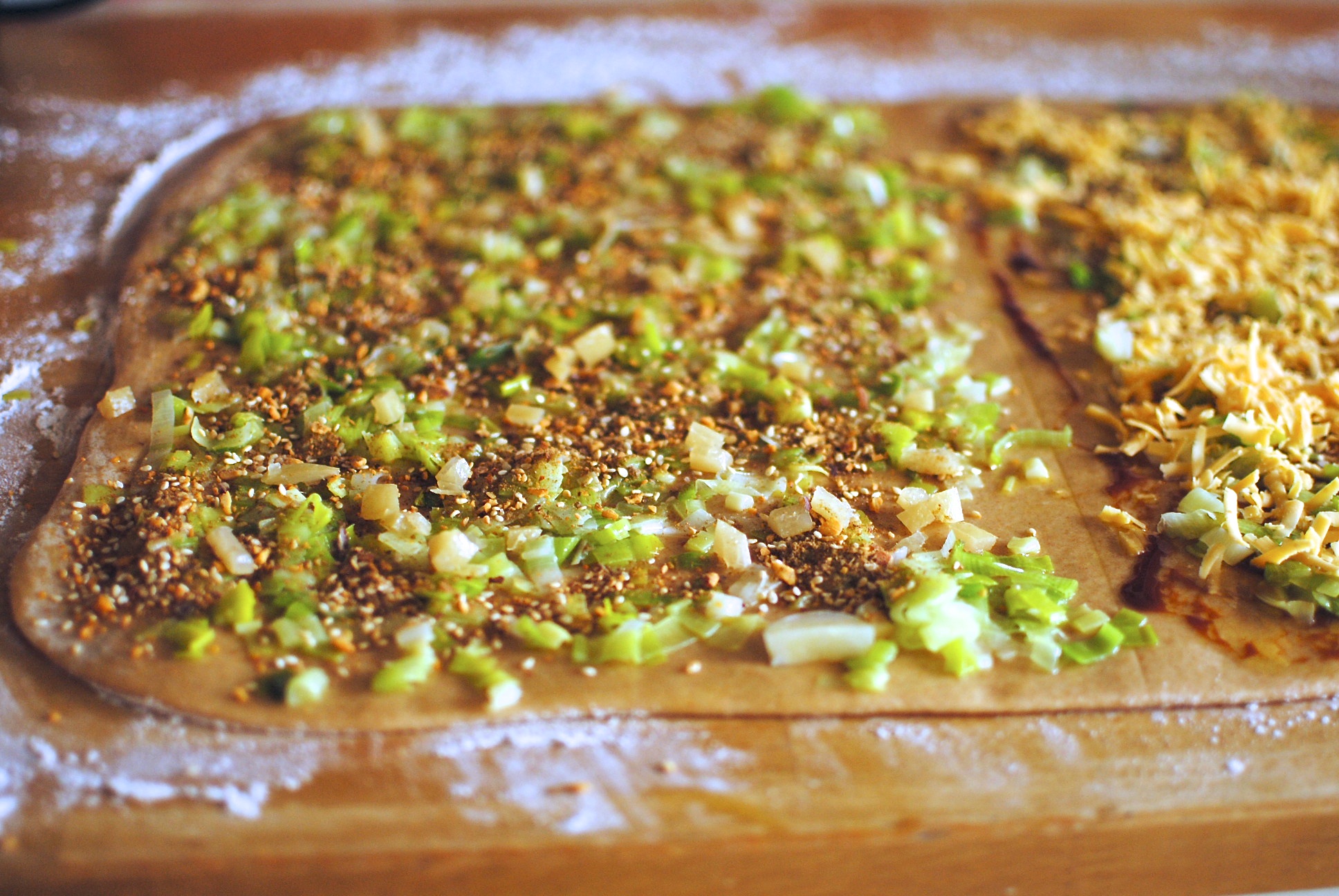 I’ve given you two fillings to choose from. Or do as I do and make both in one batch. First, a decidedly British filling of Marmite – that love or hate yeasty condiment, Cheddar cheese and softly sautéed olive oil leeks. And then a very simple melting leek, preserved lemon and dukkah one that gives a respectful bow to the Middle East. Add crumbled best goats cheese or feta to the latter if you so desire, but perhaps ditch the preserved lemon. The beautifully malleable dough will, I hope, inspire other, more personal, flavour ideas from you. Let me know what you come up with. I am already dreamily spinning ideas.